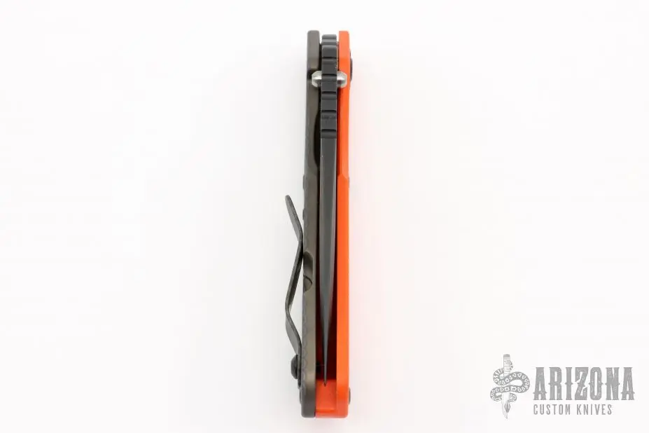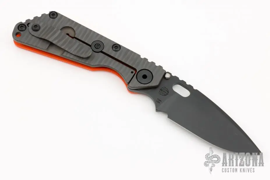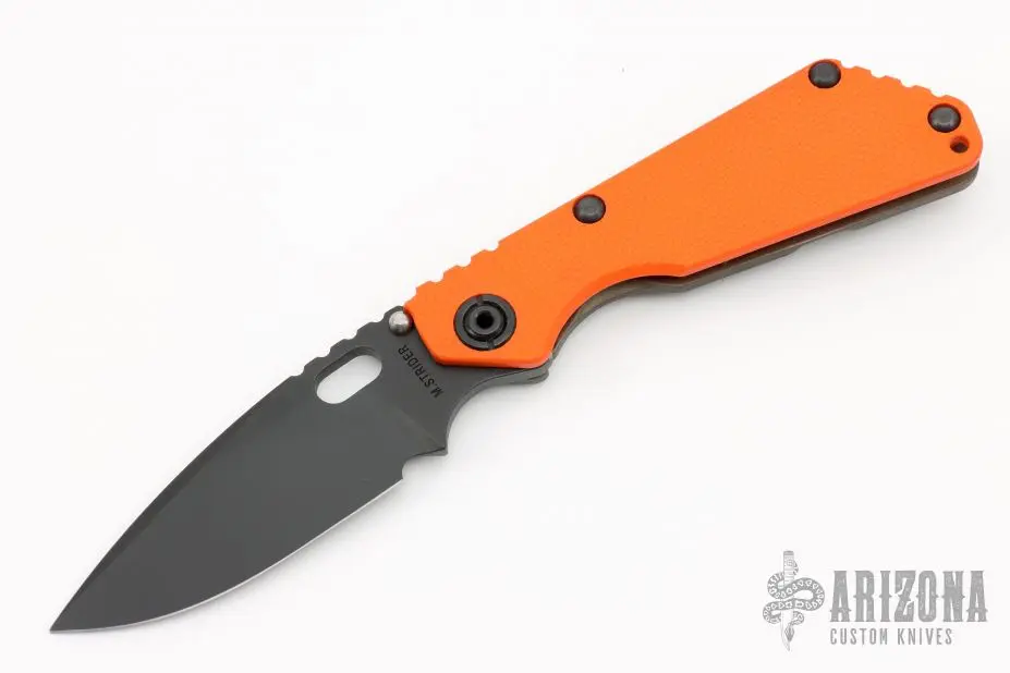 This Strider SNG framelock folder features a black blade with thumbhole and notched thumbrest. The handle has an orange G-10 and flamed titanium frame with titanium clip, tip up carry. Jimping on blade spine. Nice lockup, and blade seating. New condition.Â