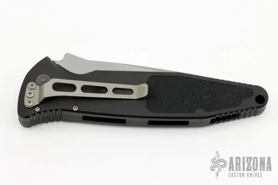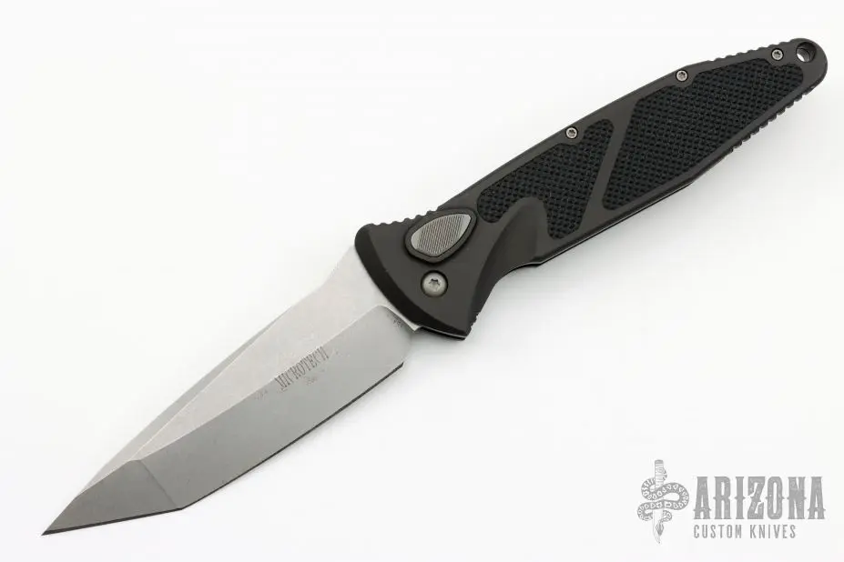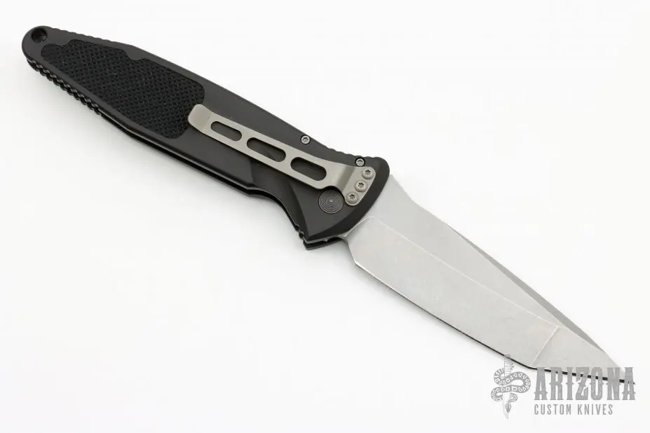 This Socom Elite auto by Microtech has a tumbled tanto blade. The handle is aluminum with rubber non-slip inserts. Includes a nylon sheath, original box and papers.  S/N 1444. Dated: 03/2002.  Excellent condition.