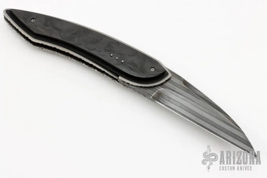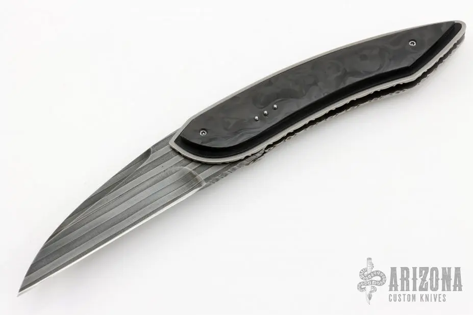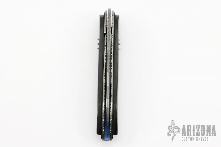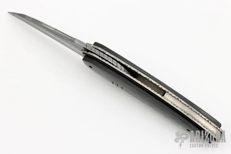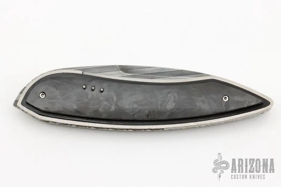 This Linerlock Flipper by Corrie Schoeman has a Pieter Goosen Damascus blade with fileworked spine/flipper and flase top edge. Handle has marble carbon fiber scales over black G-10 and fileworked titanium liners, and titanium backspacer. Nice blade seating, lockup and detent. New from maker. Comes with a zippered case and COA dated Jan 2023.