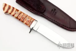 This drop point hunter by Phillip M Parris features a mirror polished blade with .130″ blade stock and 1.035″ blade depth, full tang construction. The handle has a nickel silver guard, stag scales with red liners and nickel silver pins. Comes with a maroon leather sheath. Excellent condition.