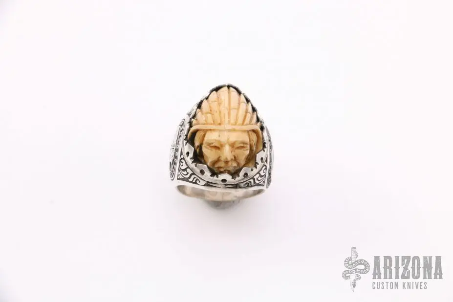 This Ring by Joe Scherhaufer is made of Sterling Silver and has a carved bone head inlay. Engravings are visible on both sides. Â Â Size: 10. Â New from Maker. Â
