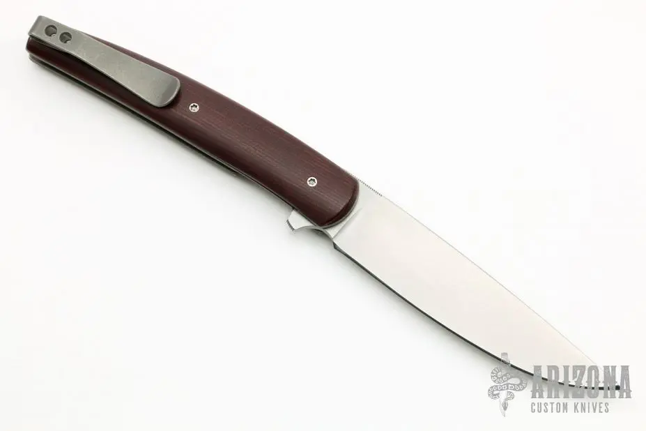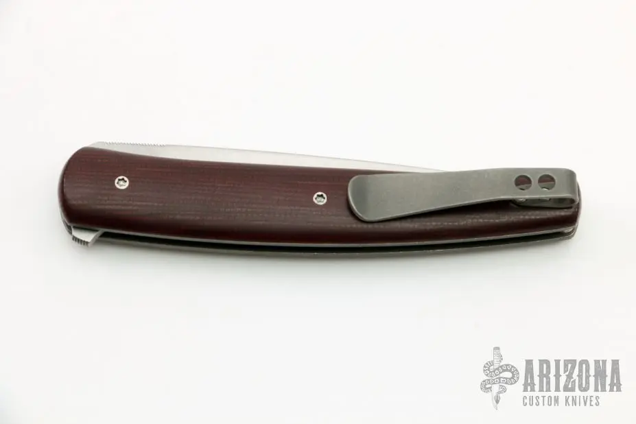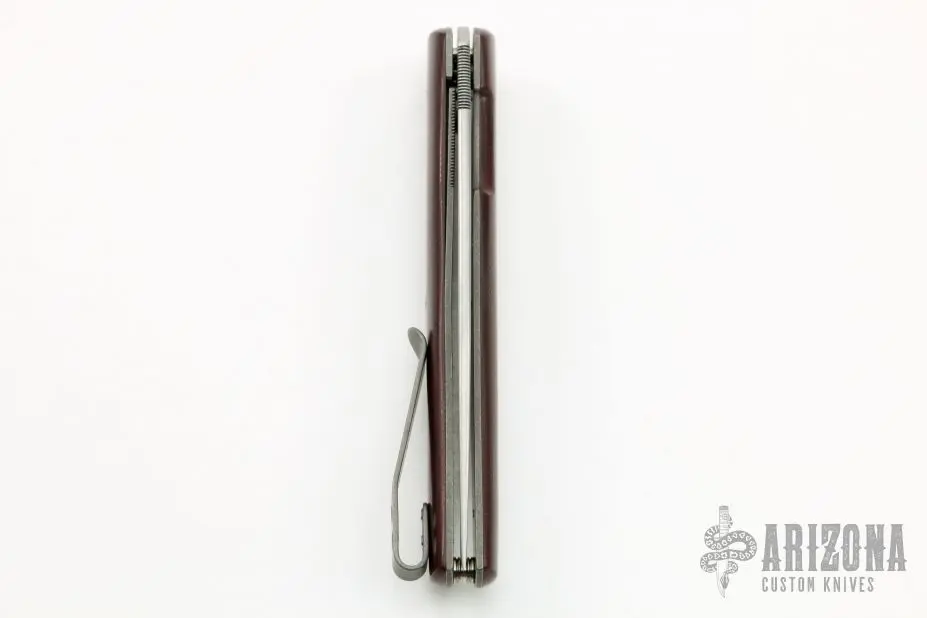 This Swayfront Flipper by Brad Zinker features a tumbled blade with notched thumbrest and flipper. The handle has red canvas micarta scales, tumbled titanium liners and a tip up titanium clip. Rides on bearings, nice detent, lockup and blade seating. Comes with zippered case. New from maker.