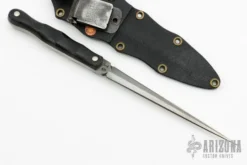 This Tactical Kukri by Nemoto Knives features a multiground acid washed blade with notched thumbrest, .233″ blade stock and 2.899″ blade depth, full tang construction. The handle has carbon fiber scales over black aluminum liners. Comes with kydex sheath. Excellent condition.