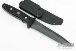 The Stryker is an extraordinary bowie style fixed blade knife with black Cerakote finish. It Features a strong clip point D2 blade with full tang construction complimented by a heavily milled, skeletonized handle that helps achieve a wonderful balance and also sheds the weight that is the enemy of those on the move. This knife has the unique advantage of heavy-duty durability that can handle the most adverse conditions while being extremely light weight. The handle’s 3D machined black G10 handle scales are specifically contoured to naturally secure a strong, tight grip. Confident, controlled cuts are readily achieved with the jimped thumb ramp handle while intuitively designed ergonomics feature an arcing shape that feels natural in the hand and terminates at a sharp pommel. Each Stryker Fixed Blade knife includes a secure lightweight kydex sheath with a belt loop system.