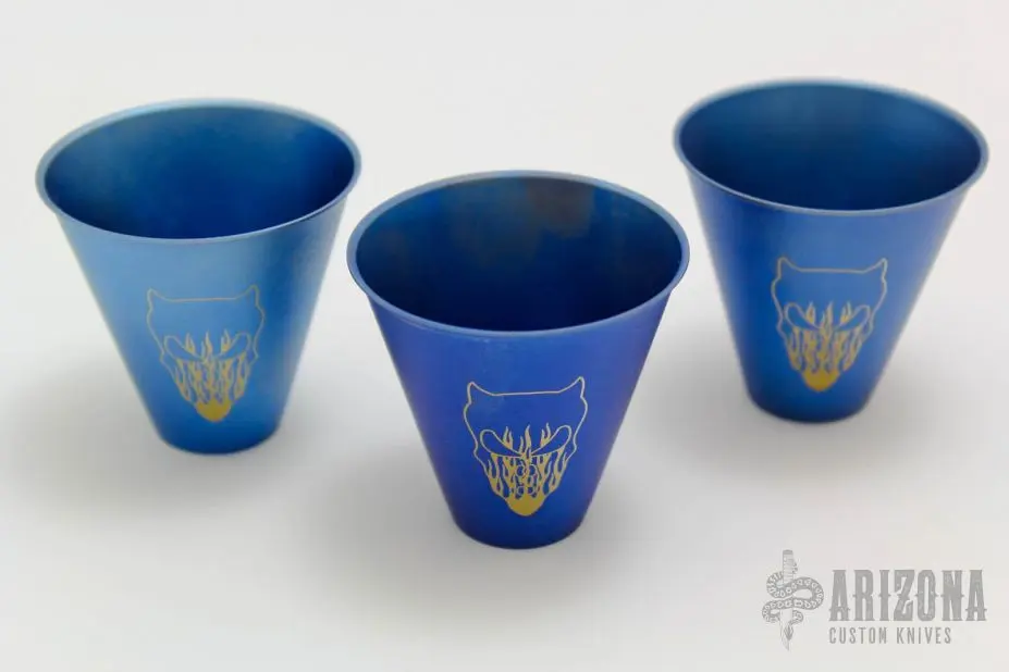 Set of 3 titanium shot glasses by Dmitry Streltsov. Anodized with Devil theme. New from maker. Includes drawstring pouch.