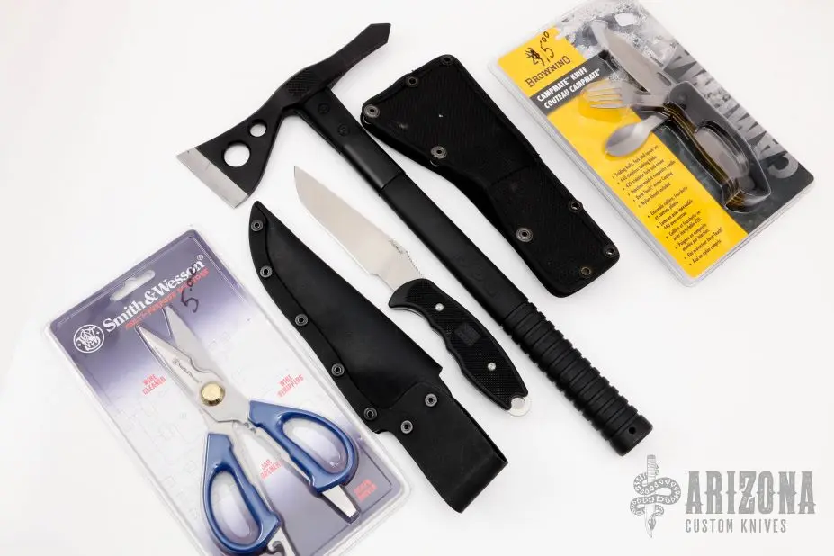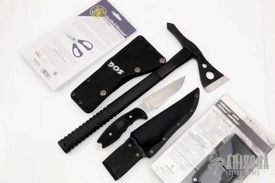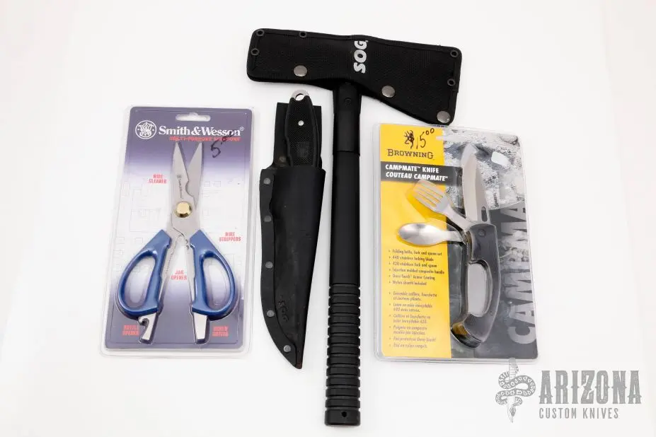 Browning Campmate Knife, Folding Knife, Fork and Spoon Set. 4 1/2″ closed. Features AUS-8 stainless locking blade. 420 stainless fork and spoon. Injection molded black composite handle with Dura-Touch Armor coating. Black nylon belt sheath. Hang packaged. Still in package