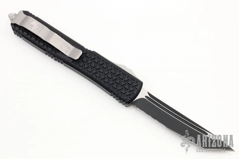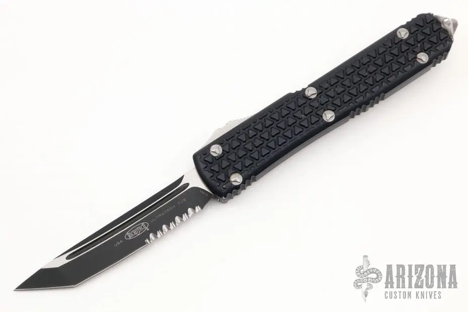 This Ultratech OTF automatic features a T/E two-tone partially serrated blade. Stainless steel clip. Glass breaker. S/N 63573. Date 02/2016. Comes with wrong MT box and papers. Has some scuffs and scratches, great condition otherwise.Â