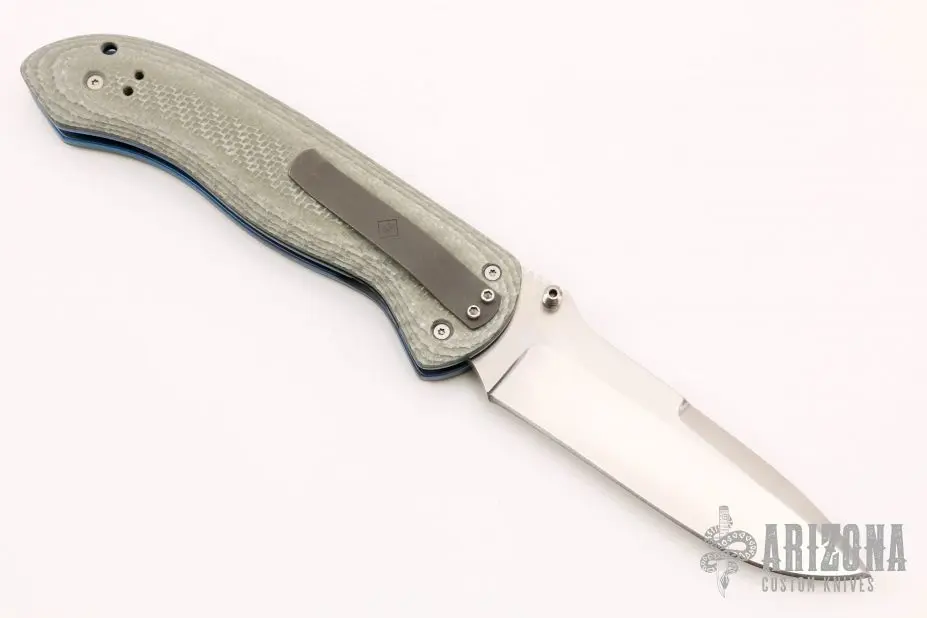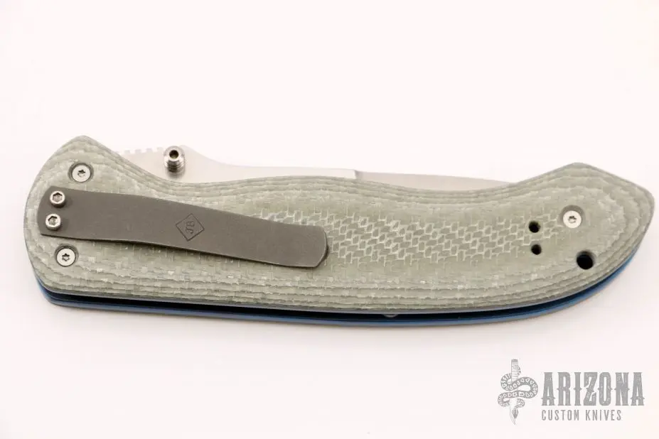 This Urban Combat Linerlock folder by Jim Burke features a spear point hand rub satin finished blade with dual thumbstuds and a notched thumbrest. The handle has silver twill scales, orange peel finished and anodized titanium liners, tip down bead blast titanium clip, up/down reversible. Nice lockup, and blade seating. Excellent condition.