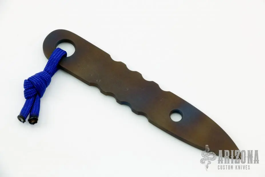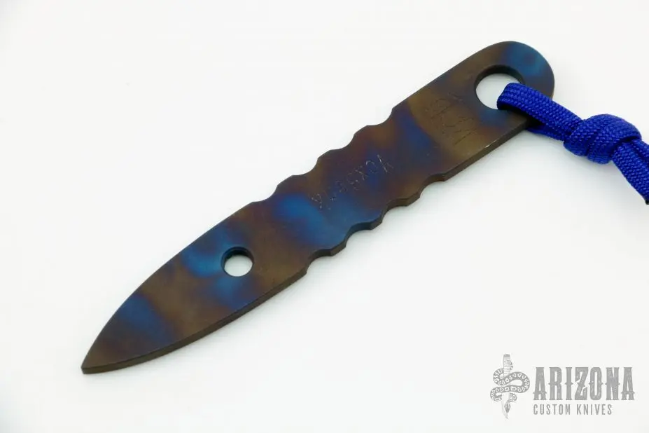 This VoxBonk by Vox Knives features an anodized titanium body with notches, .144″ stock and .750″ depth, lanyard hole at the butt. Has a couple light scuffs, otherwise excellent condition.