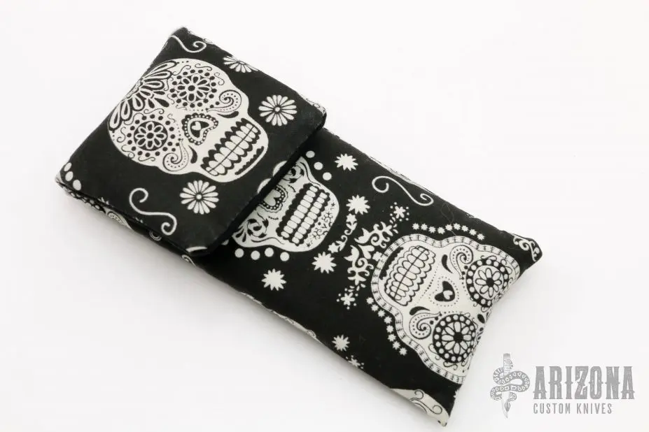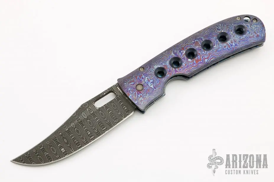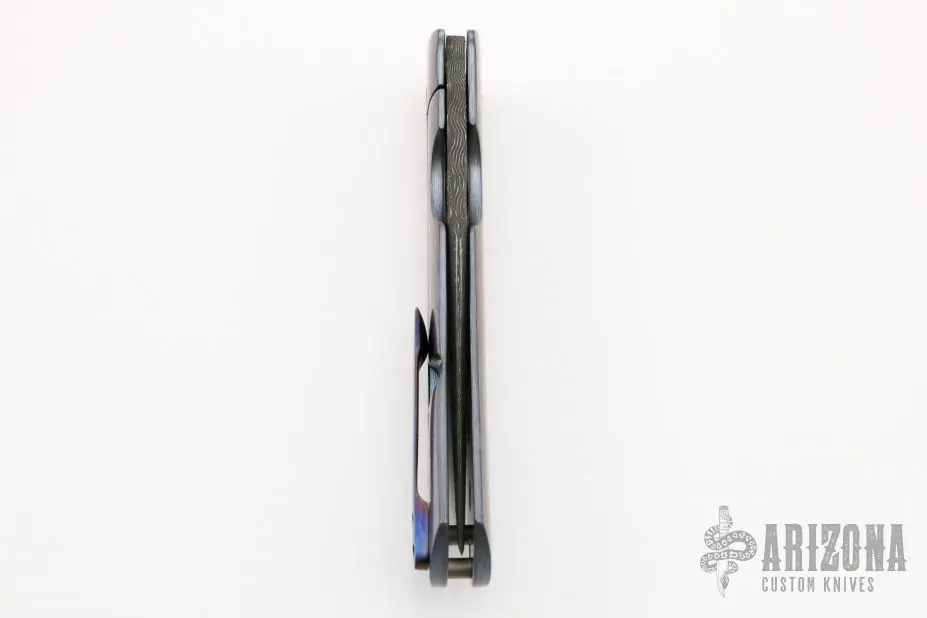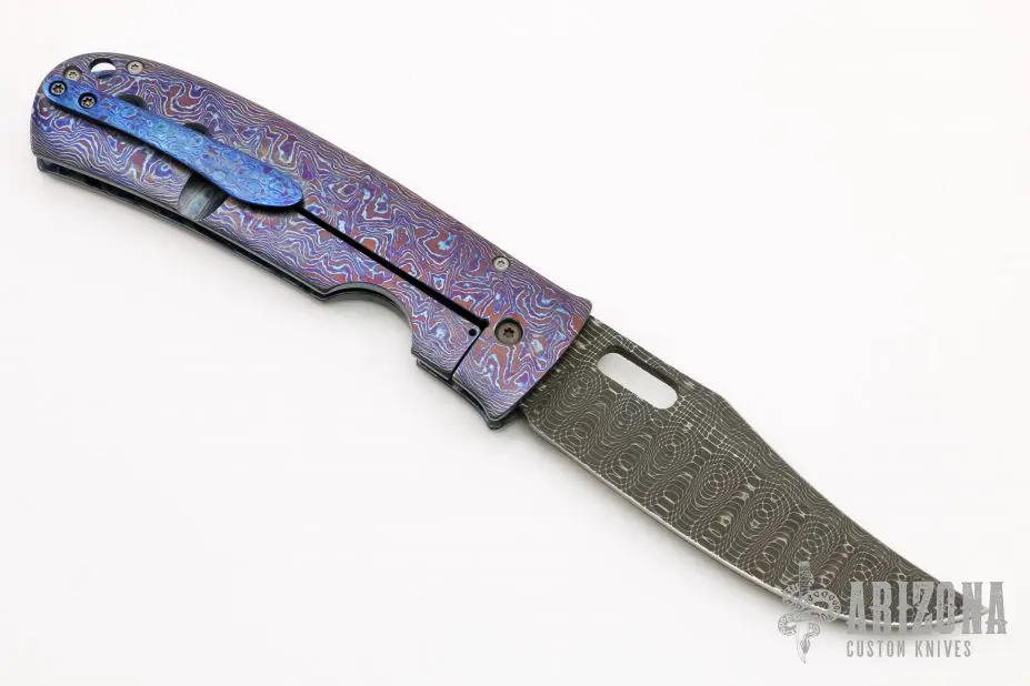This XL Bowie framelock folder by Tom Mayo features a clip point Damascus blade with thumbhole and false top edge. The handle has a full timascus frame and tip up clip. Smooth action. Nice blade seating, detent and lockup. Excellent work. Comes with a Velcro case. Excellent+ condition.