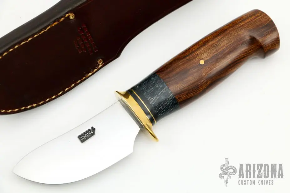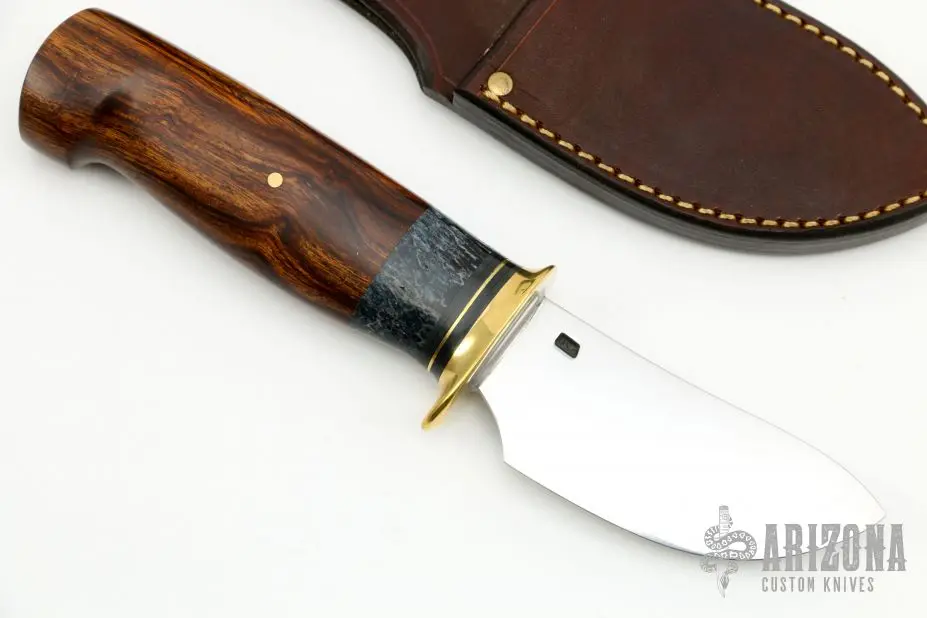 This XL Hanks Skinner from Rocco Handmade features a satin finish blade with .151″ bladestock and 1.394″ blade depth, and hidden tang construction. Has brass guard, black/brass/stabilized ram horn spacers, and a desert ironwood grip with a brass pin and a compass in the butt. Comes with a Treeman leather shop sheath. New from maker.